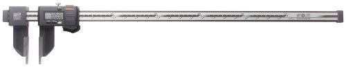 The 550-341-10 has the ABSOLUTE electrostatic capacitance linear encoder. It weighs 380 g and measures outer diameter (OD) and inner diameter (ID). Its nib-style jaws have round measuring faces with a nib length of 12 mm, a jaw depth of 75 mm. Main scale length is 445 mm and beam width is 20 mm. Range is 0 (0.4") - 12"/0 (10) - 300 mm, LCD Resolution is 0.0005"/0.01 mm, Repeatability is 0.0005”/0.01 mm, and Accuracy is rated at + or - 0.0015". Also included are origin-setting, zero-setting, inch-to-metric conversion, offset/preset, and on/off automatic shutoff function buttons. A Digital LCD Data Reading Hold function is available with the optional Data Hold Unit (959143), sold separately. An alarm alerts the user to low voltage and counting value composition errors. A thumb screw locks the scale’s position. Response speed is unlimited. Model 550-341-10 meets standard IP67 for protection against dust and temporary submersion in water. The caliper has Statistical Process Control (SPC) data output capability for manufacturing quality control. It outputs data using a serial data interface to a computer or other dedicated recording device using SPC cable with data switch (959149 or 959150, depending on cable length; sold separately). It draws 1/4 the battery power when switched on and about 1/8 the battery power when switched off compared to other digital calipers. The SR44 silver oxide cell battery (938882) lasts for approximately 3.5 years of normal use and is recommended to maintain constant voltage levels.